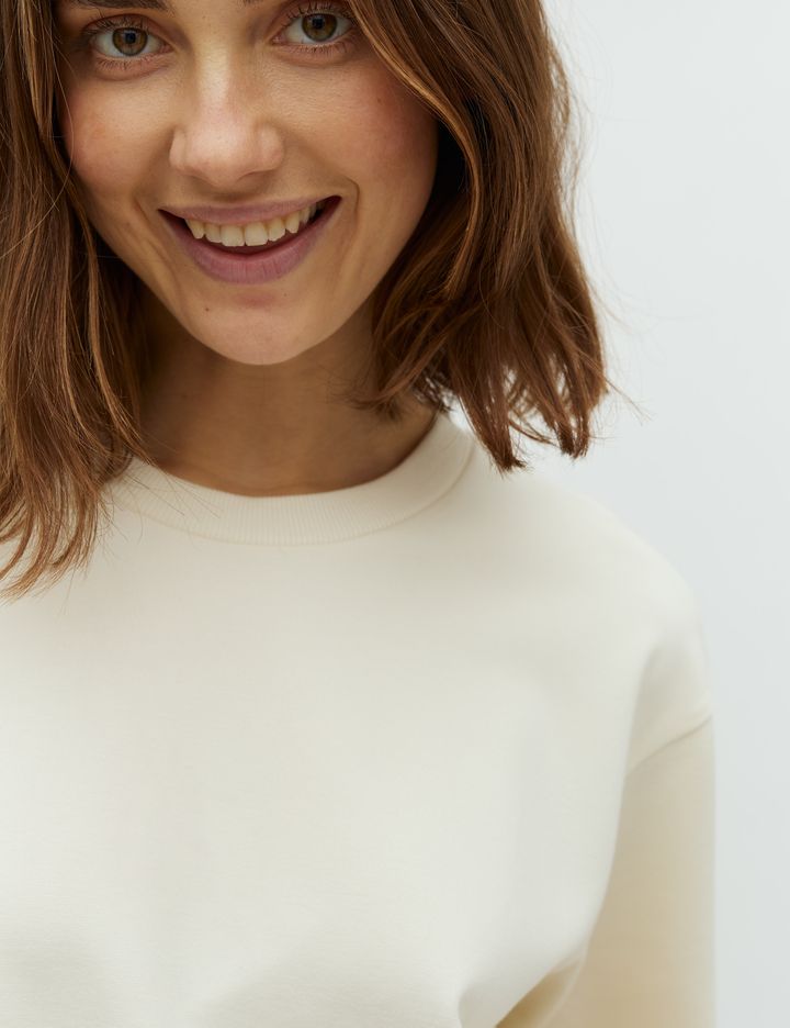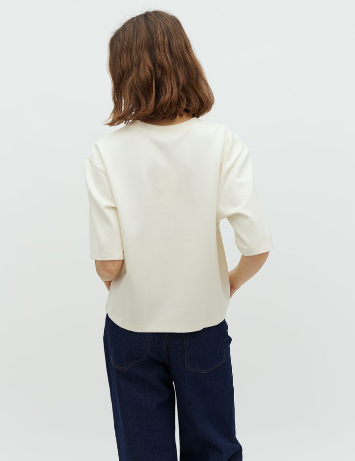 74% Viscose - 23% Polyester - 3% Elastane Short wide sleeves Round neck with ribbed hem Loose fit Regular lenght True to size